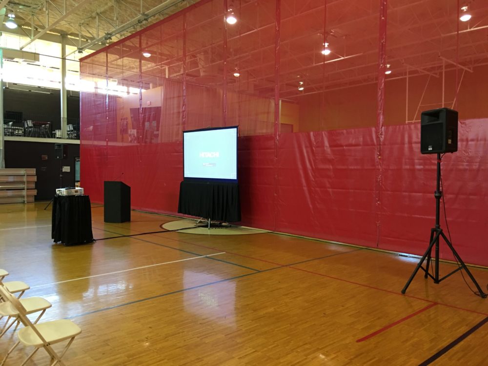 2 Speaker sound system, 3k projector and 8 ft. tripod screen with carpeted lectern for local YMCA.